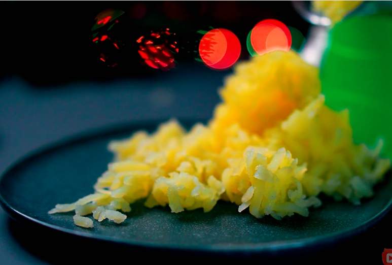 Atsevišķi sarīvējam kartupeļus un burkānus. Vārītām olām atdalām baltumus no dzeltenumiem un arī tos atsevišķi sarīvējam uz rupjās rīves.