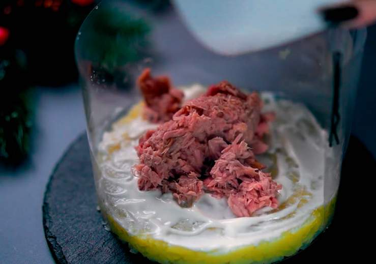 Pēc tam veidojam mērces kārtu. Tālāk liekam tunci. Šis slānis ir pietiekami sulīgs, tāpēc tam mērci nepievienoju.