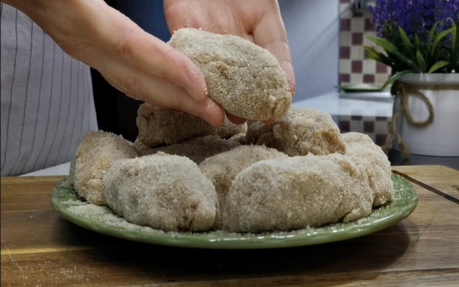 Kad gaļa atdzisusi, veidojam nelielas, glītas kotletītes. Es parasti cenšos tās veidot vienāda izmēra, lai visas izcepas vienlaicīgi. Katru gabaliņu vēlreiz dāsni apviļā rīvmaizē. Tas radīs to foršo garoziņu, kas parasti ir tikai ceptām kotletēm.