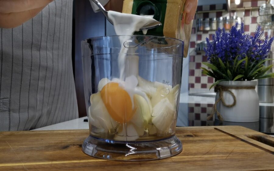 Bļodā vai blenderī liekam smalki sagrieztu sīpolu, ķiploku, iesitam olu un pielejam četras ēdamkarotes piena. Tas viss jāsakuļ vai jāsablendē putrā. Tikai pēc tam šajā šķidrajā masā ieber rīvmaizi. Sanāk tāda kā bieza putra, ko iemaisa gaļā.
