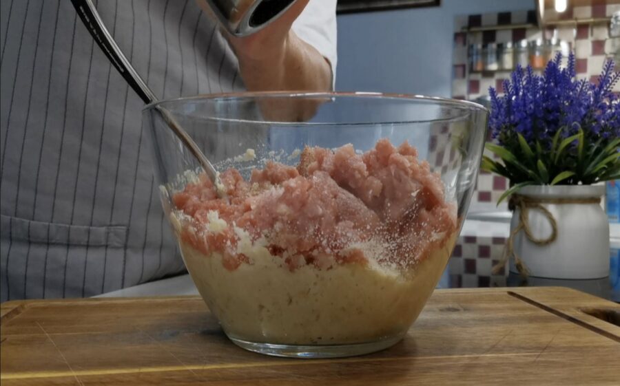 Vispirms jāsagatavo maltā gaļa. Vislabāk derēs cūkgaļa, kurā ir pavisam nedaudz treknuma. Es parasti izvēlos liesāku gabalu, jo tā jūtamies labāk, bet nedaudz tauku nekaitēs. Kad gaļa samalta, liekam to malā un ķeramies pie galvenā – “maģiskā” maisījuma.