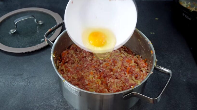 Kāpostu iepriekšēja sautēšana ar burkāniem un sīpoliem ir mans noslēpums! Dārzeņiem ir laiks karamelizēties, kļūstot saldiem un aromātiskiem, padarot gatavos kāpostu tīteņus neticami sulīgus un bagātīgus, atšķirībā no receptēm ar svaigiem vai vārītiem kāpostiem. Tagad, kad gan rīsi, gan dārzeņi ir gatavi, ķersimies pie pildījuma. Rīsiem pievienojiet 600 g maltās gaļas. Pievienojiet kāpostus. Pievienojiet 1/2 tējkarotes sāls un melnos piparus pēc garšas. Rūpīgi samaisiet.