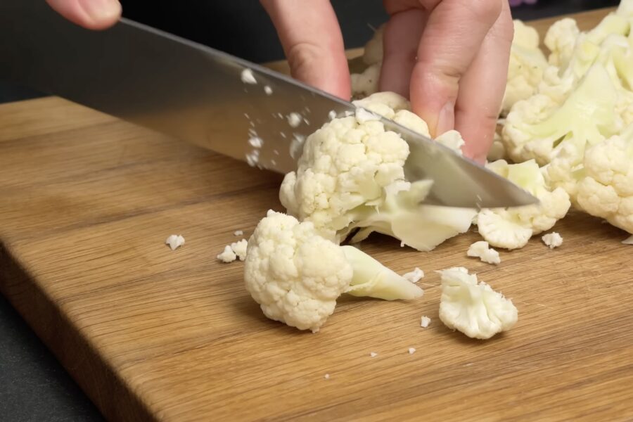 Lai viss izdotos, es ņemu apmēram 600 gramus puķkāposta. Es to nesagriežu ar nazi lielos klučos, bet gan ar rokām sadalu pēc iespējas mazākās “rozītēs”. Ja tās ir pavisam mazas, tās pannā izcepas zibens ātrumā. Man garšo, ja puķkāposti ir nedaudz kraukšķīgi, nevis pārvērtušies putrā.