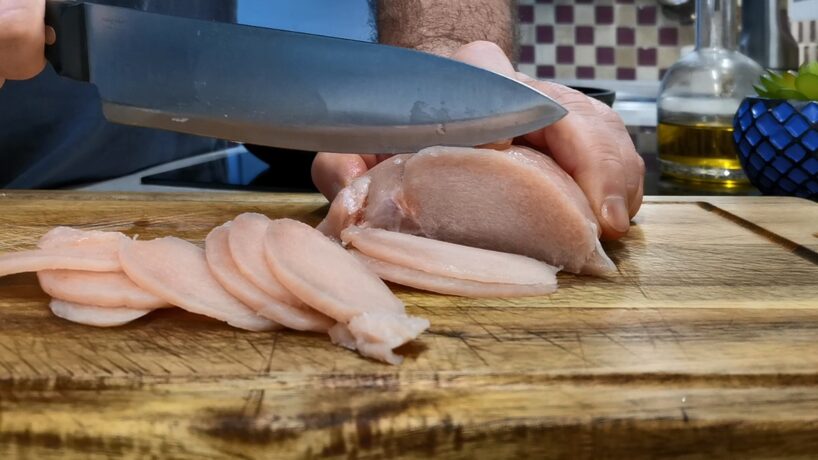 Lai ēdiens izdotos, viss jāsāk ar pareizu gaļas sagatavošanu. Krūtiņu visērtāk sagriezt plānās, vienmērīgās šķēlēs tad, ja tā ir nedaudz piesalusi vai nav pilnībā atlaidināta.