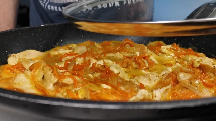 Kad dārzeņi ir apcepti, pannā atkal liek vistas gaļu un visu pārlej ar sagatavoto mērci. Ļauj tai uzvārīties, tad uguni samazina un pannu aizver ar vāku. Uz lēnas uguns vistas krūtiņa sautējas apmēram desmit minūtes, kļūstot maiga, sulīga un aromātiska. Kad ēdiens gatavs, to var pārkaisīt ar svaigiem zaļumiem, kas piešķir ne tikai krāsu, bet arī patīkamu, viegli spirgtu garšu.