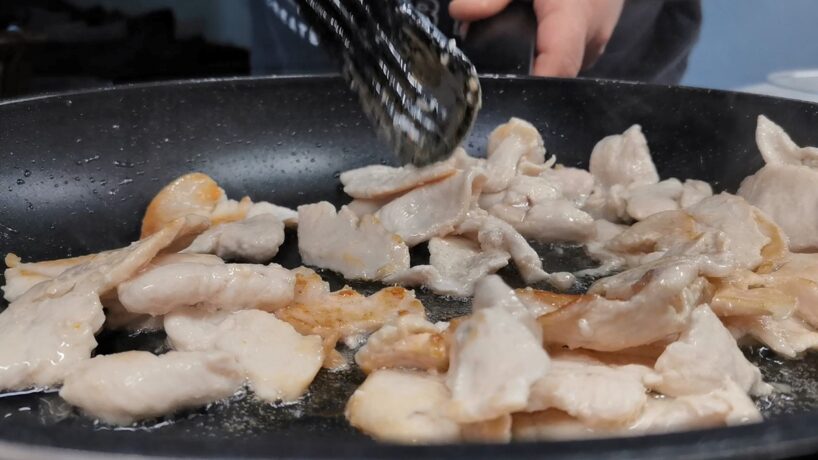 Tas ļauj to griezt precīzāk, un gabaliņi cepšanās laikā gatavojas ātrāk un vienmērīgāk. Sagriezto vistu liek uz sakarsētas pannas ar nedaudz eļļas un cep uz stipras uguns. Šajā brīdī gaļai vēl nepievieno nekādas garšvielas. Pietiek ar dažām minūtēm, līdz gabaliņi skaisti apbrūnē, kļūst viegli zeltaini un atsulojas. Kad tas izdarīts, vistas gabaliņus noņem no pannas.