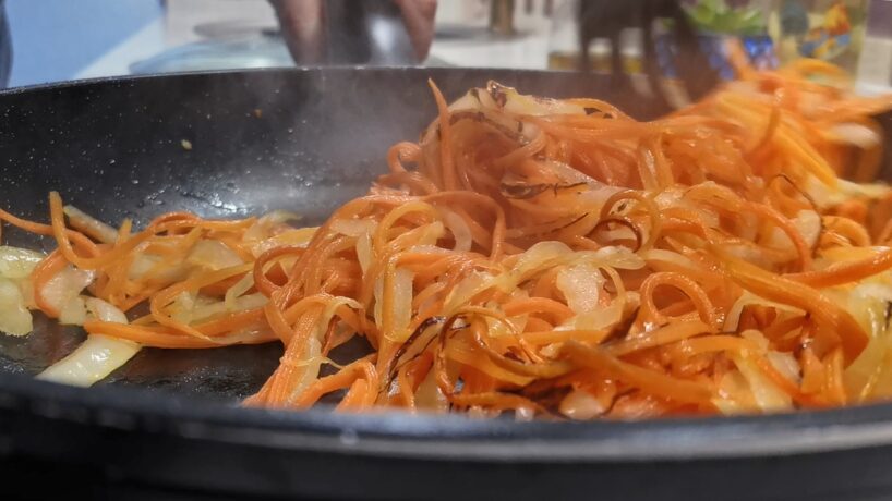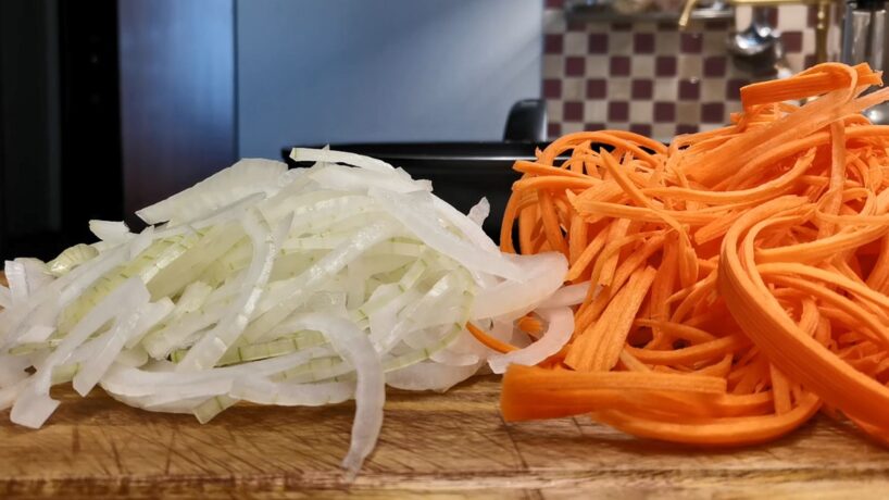 Sīpolu sagriež pusgredzenos, bet burkānu plānās, garās strēmelēs, lai tas ātri mīkstinās un nezaudē savu struktūru. Pannā dārzeņus apcep uz stipras uguns, pievienojot arī izspiestu ķiploku. Šis aromātiskais pamats ir ļoti svarīgs, jo tieši šeit rodas ēdiena pamatgarša.