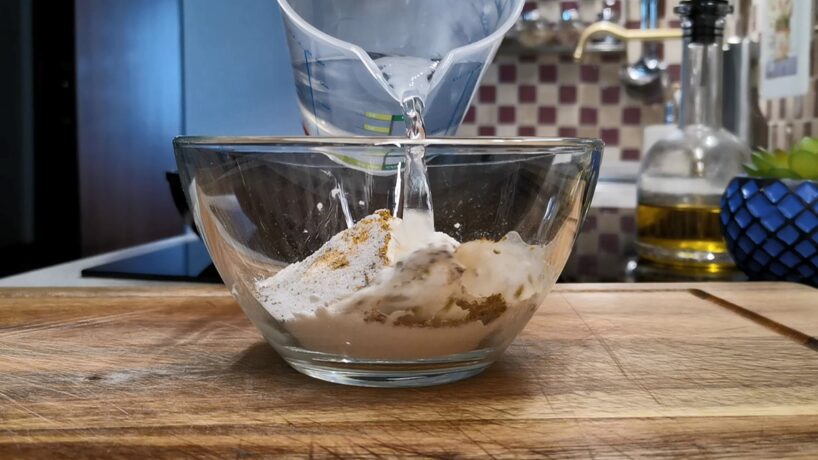 Īpašo maigumu šim ēdienam piešķir pavisam vienkārša mērce, kas pagatavojama dažās minūtēs. Bļodiņā sajauc skābo krējumu, ūdeni, nedaudz miltu un garšvielas.