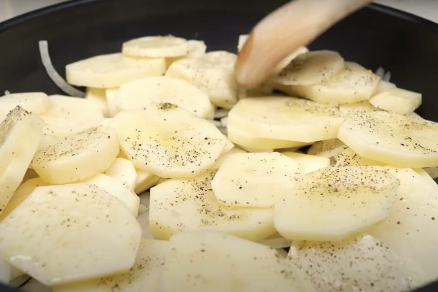 Kartupeļus nomazgājiet, nomizojiet un sagrieziet plānās ripiņās. Šis ir svarīgs moments – ja kartupeļi būs pārāk biezi, tie var nepaspēt izcepties vienlaikus ar vistu. Kārtojiet kartupeļus virs sīpoliem, pārkaisiet ar sāli, melnajiem pipariem un, ja garšo asums, pievienojiet nedaudz sarkanos piparus.