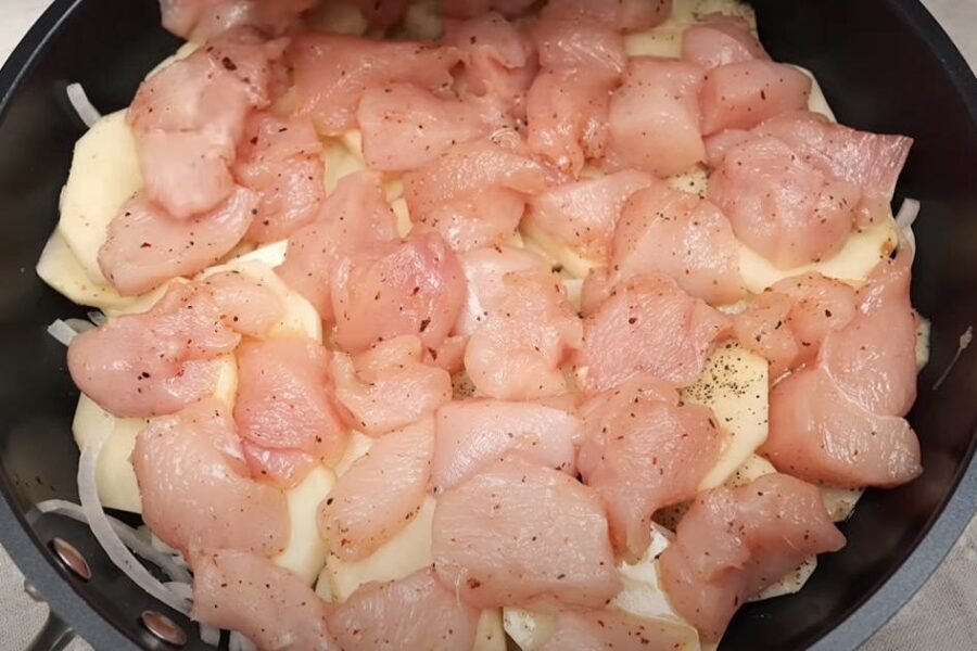 Vistas fileju nosusiniet un sagrieziet nelielos, kumosa lieluma gabaliņos. Lieciet gaļu bļodā, pievienojiet nedaudz sāls un piparu, un kārtīgi samaisiet ar rokām. Ir svarīgi, lai katrs gaļas gabaliņš būtu apviļāts garšvielās. Pēc tam kārtojiet vistu vienmērīgā slānī virs kartupeļiem.