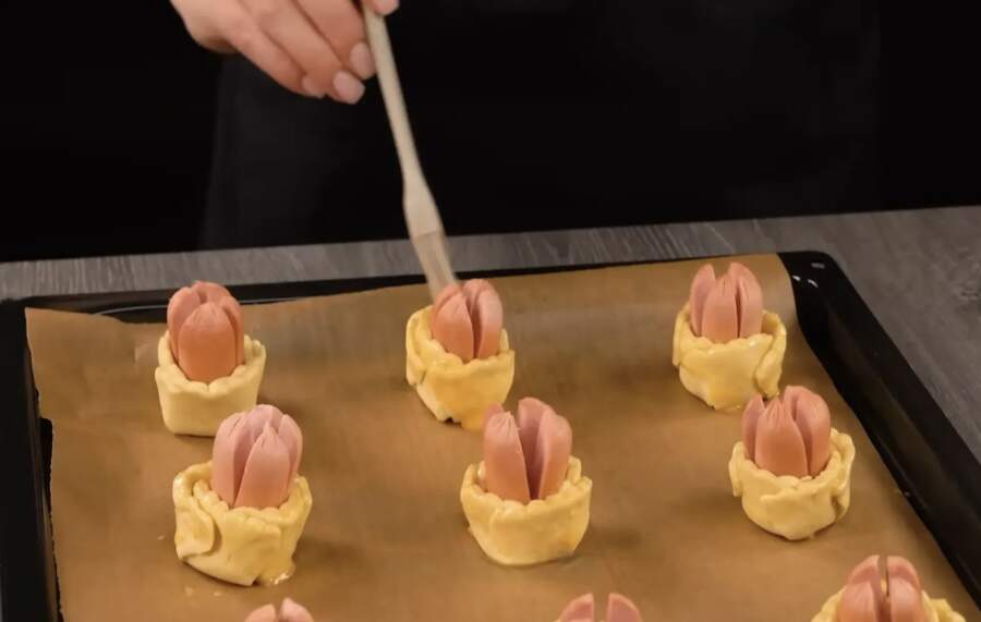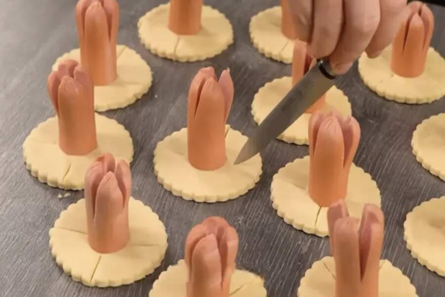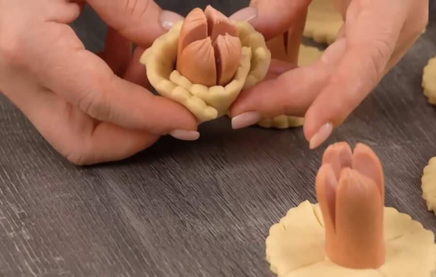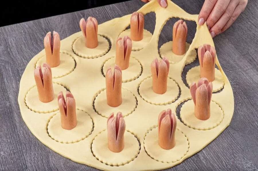 Desiņas sagatavo, pārgriežot tās uz pusēm un vienā galā veicot vairākus iegriezumus. Kad desiņu novieto vertikāli uz mīklas aplīša, mīklas malas četros punktos iešķeļ un paceļ uz augšu, piespiežot pie desiņas sāniem. Rezultātā izveidojas kaut kas līdzīgs ziedpumpuram, kas karstuma ietekmē “atplauks”. Pirms likšanas krāsnī mīklas maliņas apsmērē ar sakultu olu, lai tās iegūtu kārdinošu spīdumu.