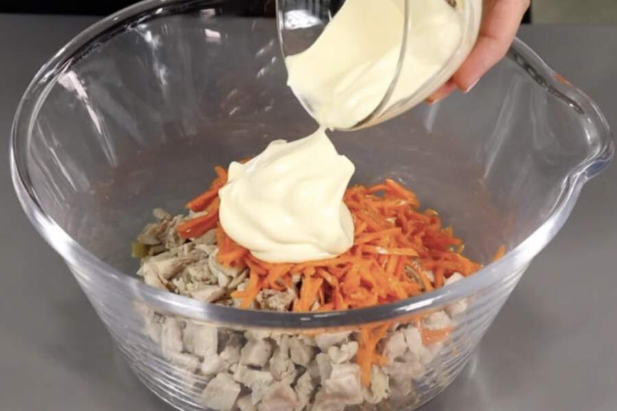 Kad visas sastāvdaļas ir sagatavotas un sēnes pilnībā atdzisušas, es tās lieku lielā bļodā. Svarīgi ir gaidīt, kamēr ceptie produkti atdziest, citādi salāti ātri sabojāsies. Es pievienoju vistu, gurķus un burkānus. Beigās pielieku majonēzi un visu kārtīgi samaisu. Esmu pamanījis, ka sāli papildus vairs nevajag, jo to pietiekami dod gan gurķi, gan korejiešu burkāni.
