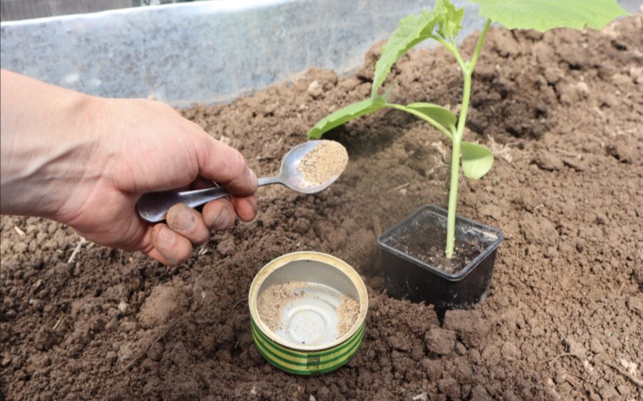 Stādīšanas brīdis: Dēstus liekot dobē, katrā bedrītē ieber 2 tējkarotes sagatavotā pulvera. Tas dos pirmo “grūdienu” augšanai un sakņu nostiprināšanai.