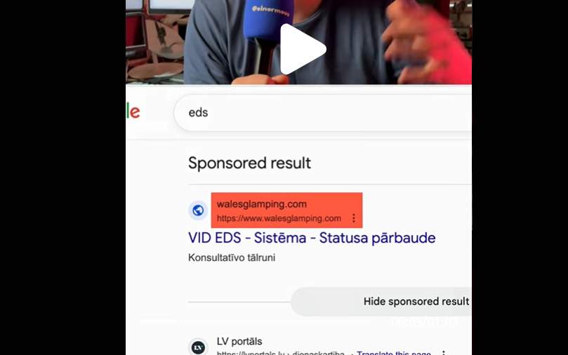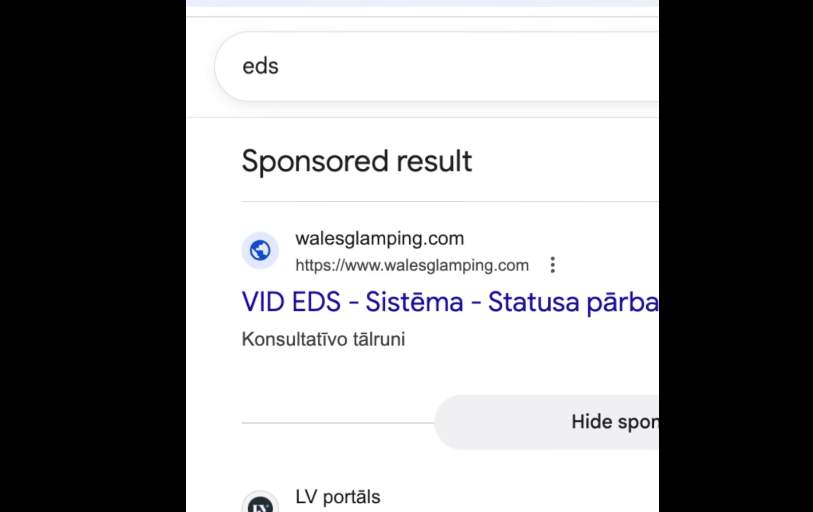 Ja tu atvēri šo domēnu, uz kura atrodas šī krāpnieka lapa, tad tur būs EDS – ergonomiskā dizaina standarts un tādā veidā viņi panāk to, ka Google tiešām uzskata, ka šī ir EDS lapa, tikai ne tā EDS, ko tu domāji, bet tas, ko viņi šeit ir uzrakstījuši un tāpēc, ka reklāma ved uz kaut kādu konkrētu saiti zem šī domēna, kur parādās krāpnieku lapa.