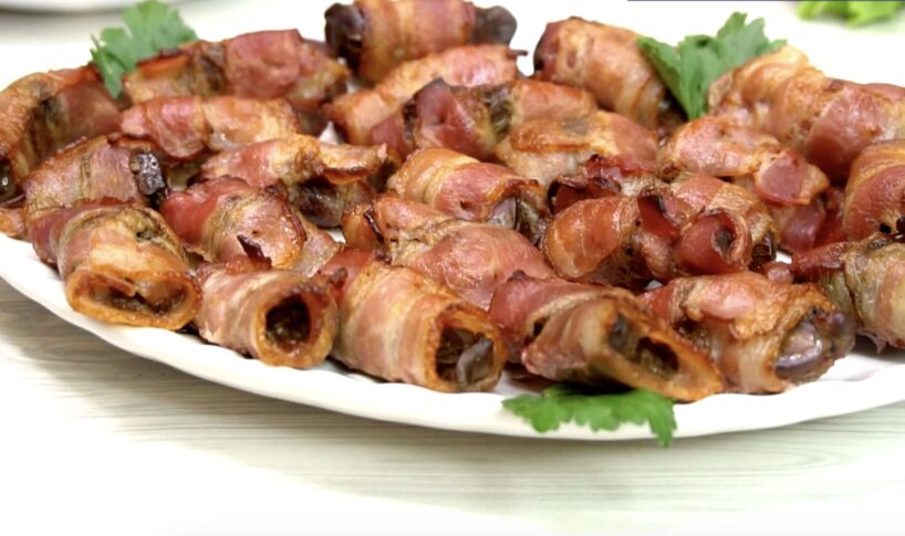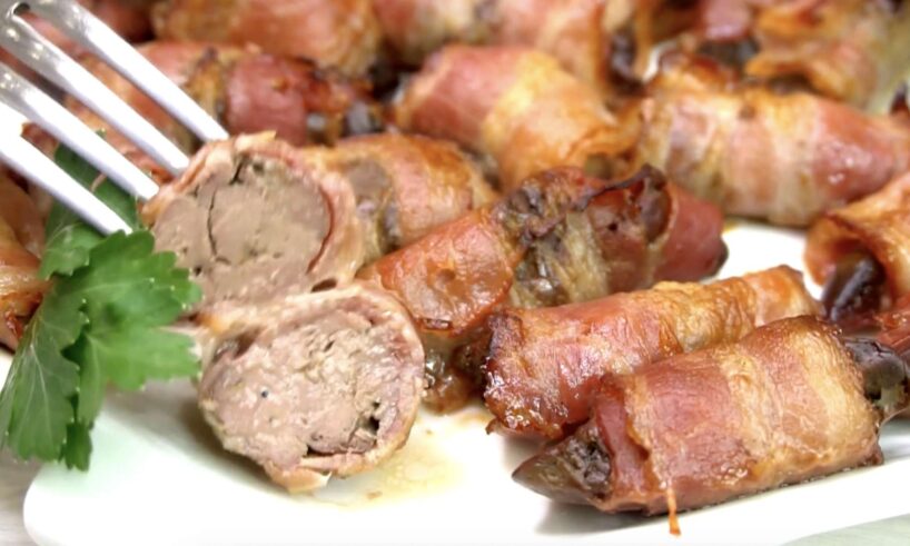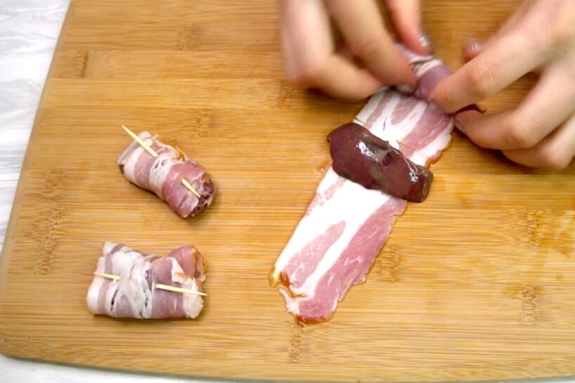 Uzkodu liek sakarsētā krāsnī 200 °C temperatūrā apmēram 20–25 minūtes — līdz bekons kļūst viegli zeltains un kraukšķīgs. Garša nemainās arī tad, ja gatavo uz pannas vai grilā: bekons apcepas, aknas paliek maigas, un aromāts ir izteikti svinīgs.