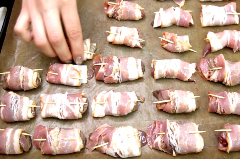 Kad aknas ir ievilkušās, sākas pats vienkāršākais posms: katru gabaliņu cieši aptin ar pusplānu bekona strēmeli. Ja nepieciešams, to nostiprina ar nelielu koka irbulīti, lai cepoties viss turētos stingri. Šis “roku darbs” aizņem tikai dažas minūtes, un tālāk viss notiek pats par sevi.