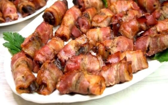 Uzkodu liek sakarsētā krāsnī 200 °C temperatūrā apmēram 20–25 minūtes — līdz bekons kļūst viegli zeltains un kraukšķīgs. Garša nemainās arī tad, ja gatavo uz pannas vai grilā: bekons apcepas, aknas paliek maigas, un aromāts ir izteikti svinīgs.