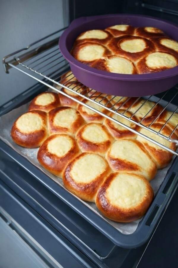 Sadala mīklu vienādās bumbiņās, liek tās uz cepšanas paplātes un ļauj uzrūgt vēl 20 minūtes. Pēc tam ar glāzes apakšu katras bumbiņas centrā izveido dziļu iedobi un ielej tajā pildījumu.