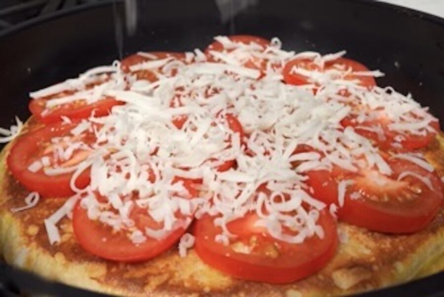 Uz jau apceptās puses uzreiz izkārto tomātu šķēles. Svaigs tomāts piešķir sulīgumu un vieglu skābumu, kas lieliski sader ar sātīgo gaļu. Visu vēlreiz pārkaisa ar atlikušo sieru un patur zem vāka vēl piecas minūtes. Siers uz tomātiem izkusīs, izveidojot tādu kā “picas” virskārtu. Kad ēdiens ir gatavs, to vislabāk sagriezt trijstūros ar picas nazi. Tā to ir ērti paņemt rokās un baudīt, kamēr siers vēl stiepjas.