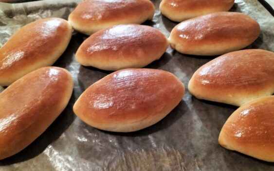 Šie ir gatavie, zeltaini brūnie pīrāgi. Es tos apsmērēju ar nelielu sviesta gabaliņu, lai izveidotu mīkstu, gardu garoziņu. No šīs mīklas ceptie izstrādājumi labi uzglabājas un paliek svaigi 2–3 dienas. Tomēr tie neglabājas tik ilgi, un mēs tos visus apēdam daudz ātrāk!