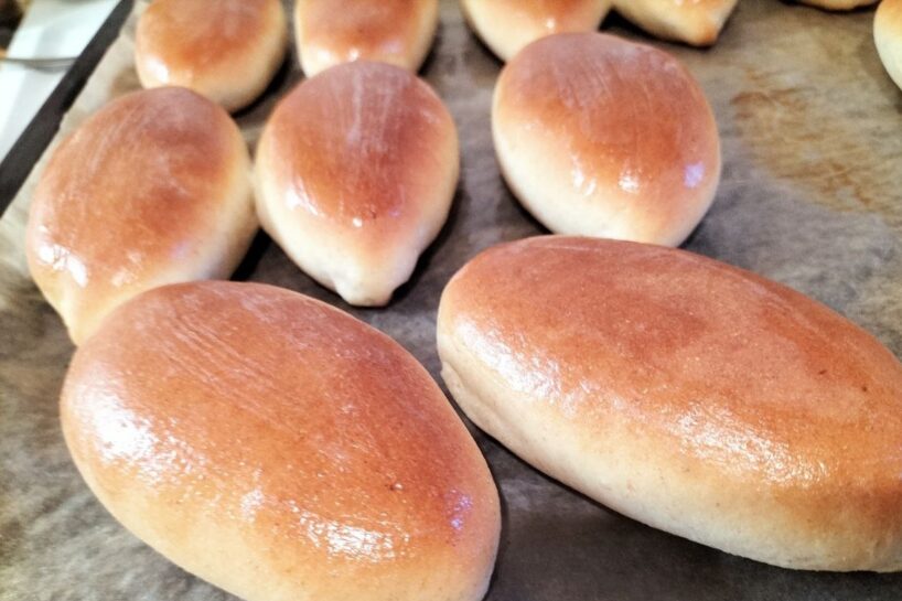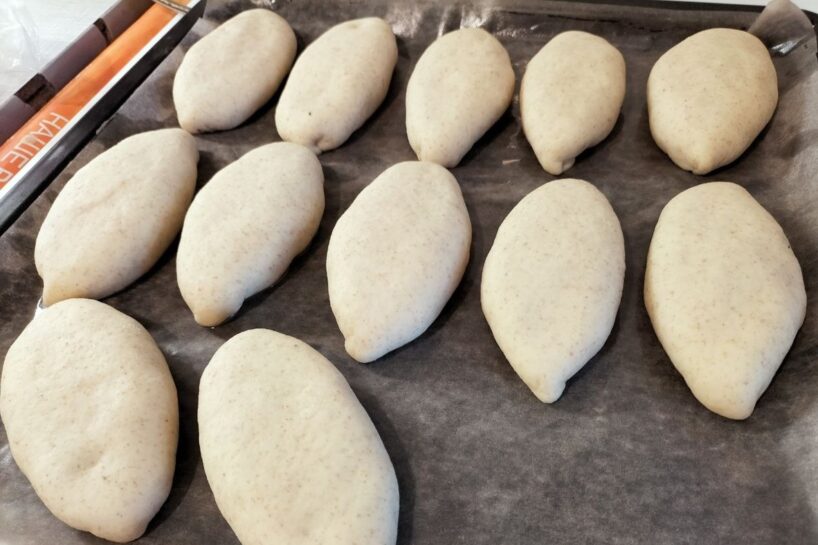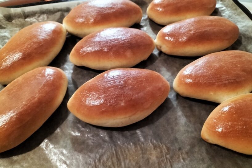Novietojiet izveidotos pīrāgus uz ar cepampapīru izklātas cepšanas pannas. Es tos neietaukoju zeltaini brūnai krāsai; tie iznāca pilnīgi labi tādi, kādi ir. Ļaujiet tiem atpūsties uz cepšanas pannas 10–15 minūtes.