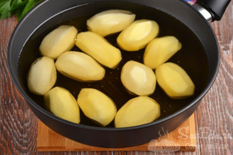 2. Kamēr kartupeļi gatavojas, ielej eļļu katliņā ar biezu dibenu vai dziļā pannā, piemēram, manējā. Ielej pietiekami daudz eļļas, lai pilnībā pārklātu kartupeļus; manējā izmanto 900 ml. Karsē uz vidējas uguns. Jo mazāku pannu izmanto, jo mazāk eļļas būs nepieciešams, bet kartupeļi būs jācep vairākās porcijās. Pievieno kartupeļus (12, 1 porcija) karstajai eļļai, atloka un apcep.