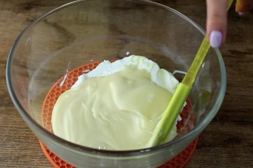 Bļodā liek krēmsieru un biezpienu. Pievieno iebiezināto pienu un visu rūpīgi samaisa līdz viendabīgai, krēmīgai masai.