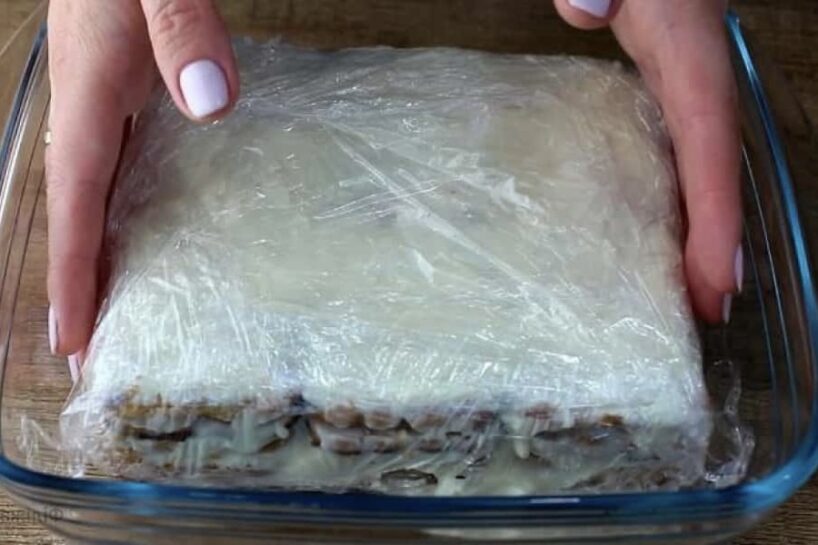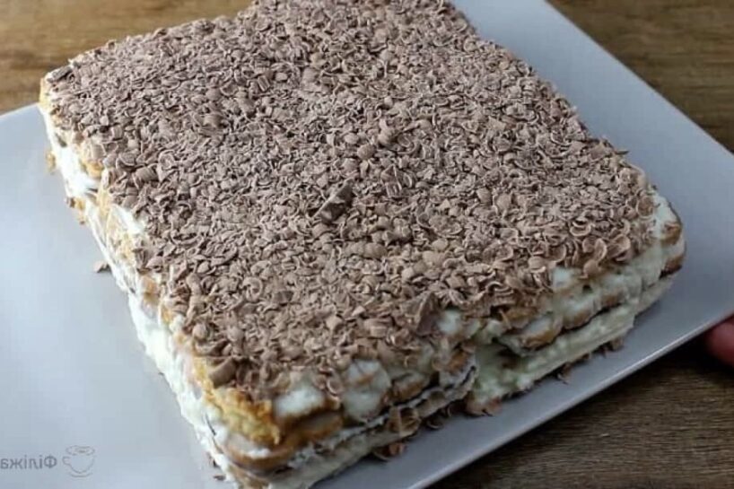 Formu pārklāj ar pārtikas plēvi un liek ledusskapī vismaz uz 2 stundām, lai cepumi izmirkst un torte kļūst stingrāka. Pirms pasniegšanas torti izņem no formas un dekorē pēc patikas – visvienkāršāk to pārkaisīt ar rīvētu šokolādi. Sagriež porcijās un pasniedz. Torte sanāk mīksta, maiga un ļoti patīkama garšā.