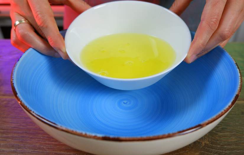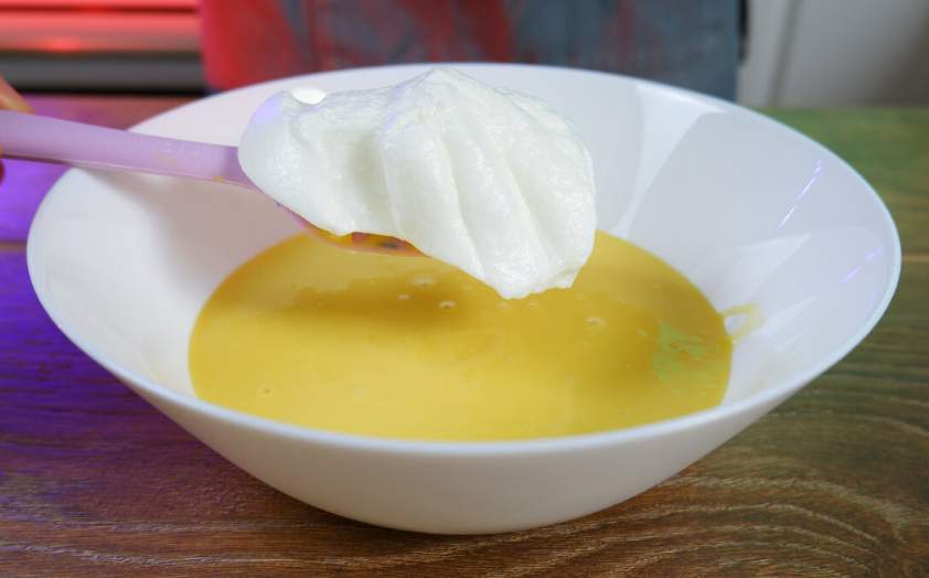 Rezultātā sanāk ļoti šķidrs maisījums. Dzeltenumu masai pievienojam nedaudz saputoto baltumu. Tad visu kārtīgi samaisām.