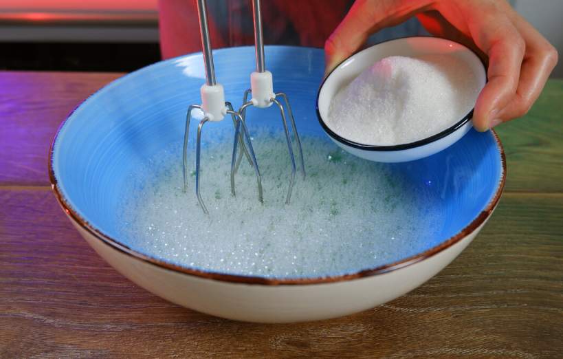 Pēc tam pamazām pieberam aptuveni pusi no receptē norādītā cukura. Turpinām kult baltumus, nedaudz palielinot ātrumu, un pievienojam atlikušo cukuru.