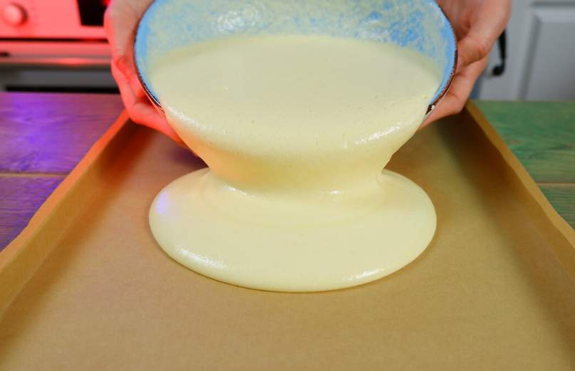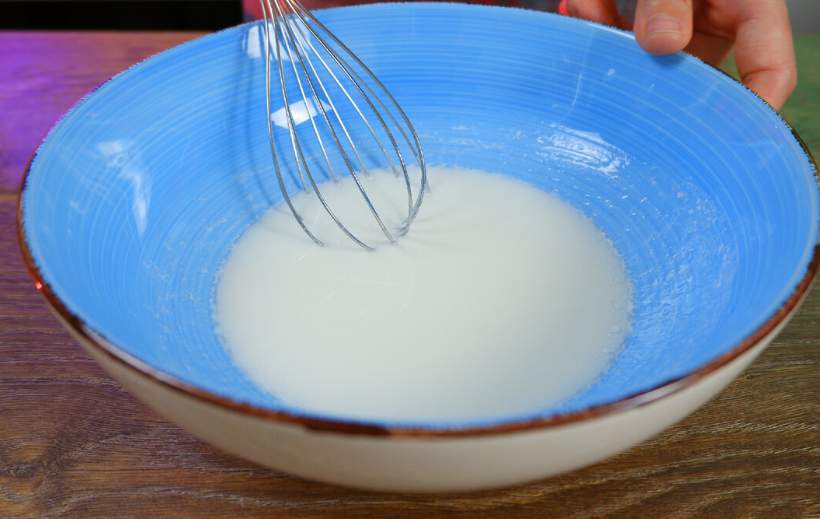 Baltumus var pārkult, tāpēc jākuļ līdz vidēju vai “mitru” putu konsistencei. Tad bļodā ielejam pienu istabas temperatūrā. Pienam pievienojam augu eļļu bez aromāta. Pienu un augu eļļu labi samaisām līdz viendabīgai masai. Bļodā pievienojam izsijātus miltus. Labi samaisām.