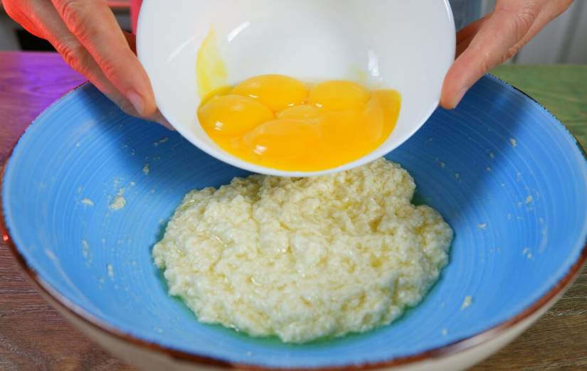 Mīklai pievienojam olu dzeltenumus. Pievienojam vanilīnu. Un visu samaisām līdz viendabīgai masai.