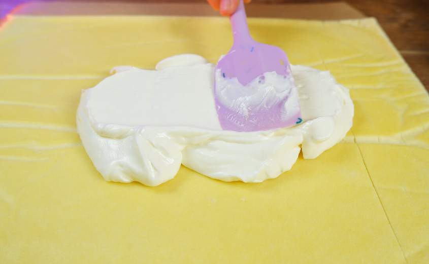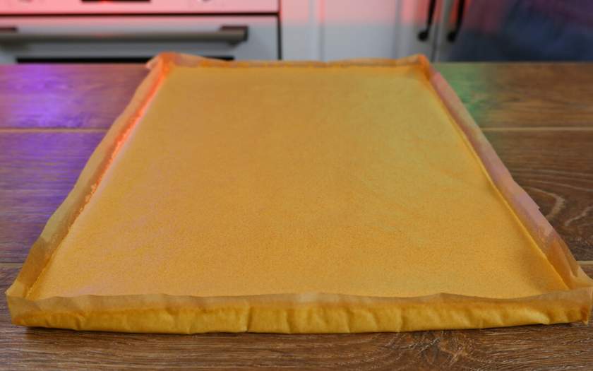 Tiklīdz biskvīts ir atdzisis, noņemam pergamentu un sākam gatavot krēmu.