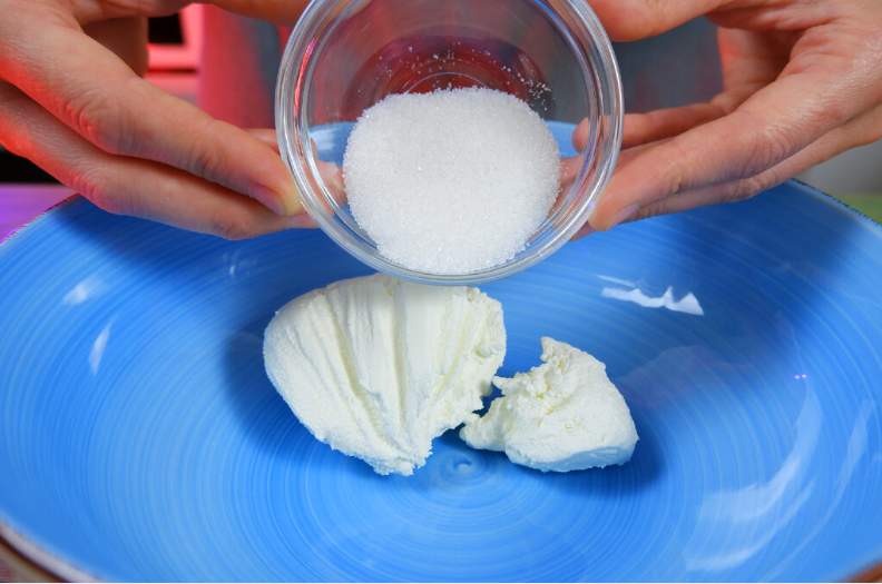 Krēmam ņemam notecinātu skābo krējumu ar 15% tauku saturu. Pieberam cukuru un kuļam pāris minūtes.