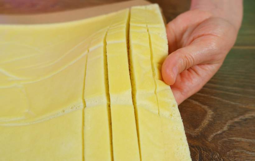 Savukārt otrā pusē veicam iegriezumus 1-2 mm dziļumā. Tā biskvītu būs vieglāk sarullēt.