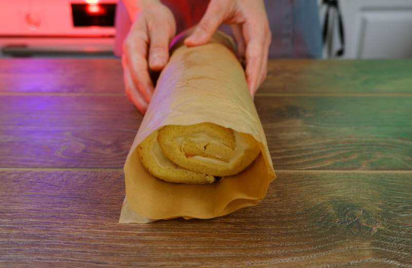 Gatavo ruleti ietinam pergamentā, liekam ledusskapī un ļaujam stundu ievilkties ar krēmu.