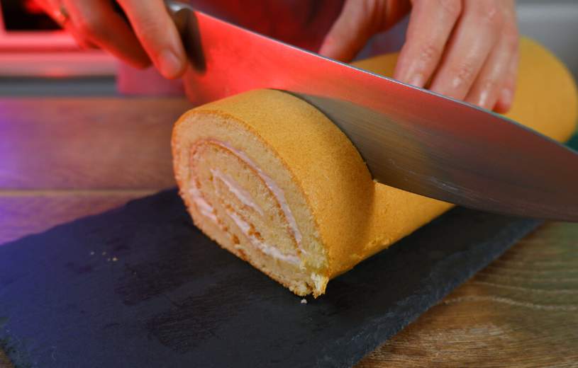 Biskvītam vienā pusē nogriežam malu 45 grādu leņķī.