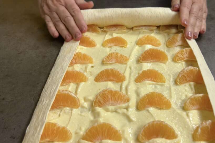 Mandarīnus kārto uz biezpiena masas, sakārtojot tos rindās un atstājot nelielu atstarpi starp šķēlītēm. Tagad salocīju lavaša malas, lai cepšanas laikā neizplūstu pildījums, un satinu to ruļļos.