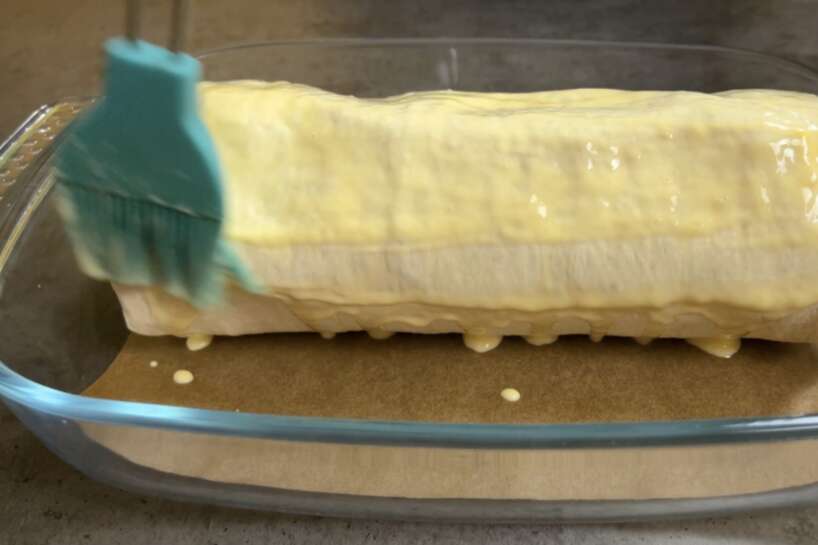 Atsevišķā bļodiņā samaisa vienu olu un 2 ēdamkarotes skāba krējuma (man ir 20% tauku skābais krējums) un apsmērē ruleti no visām pusēm.