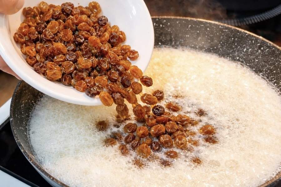 Pirms sākt gatavošanu, rozīnes ir rūpīgi jānoskalo siltā ūdenī. Veikalos nopērkamās rozīnes bieži tiek apstrādātas ar nelielu eļļas kārtiņu, lai tās nesaliptu un spīdētu. Mazgāšana palīdz ne tikai tās notīrīt, bet arī nedaudz “atmodina” sauso ogu.