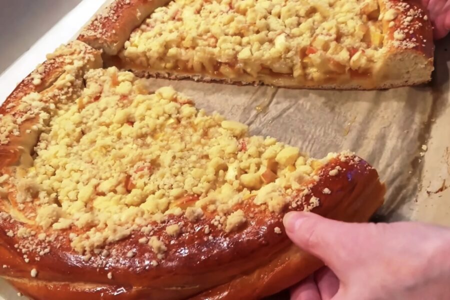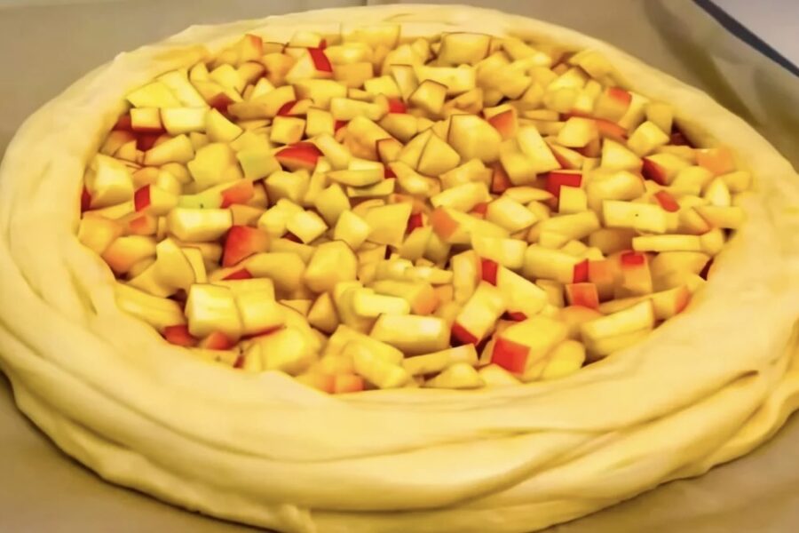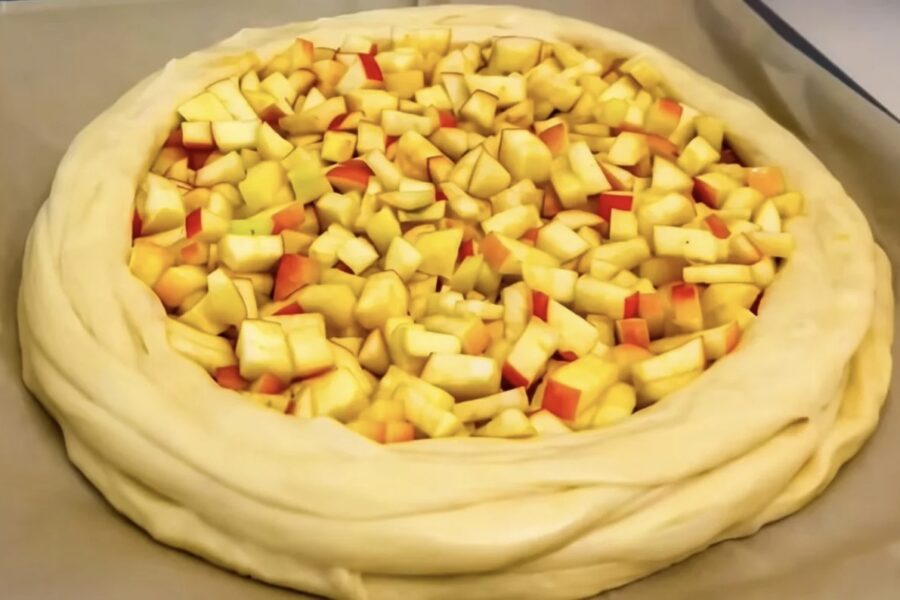 Pirms likšanas krāsnī mīklas maliņas apsmērēju ar olas dzeltenuma un piena maisījumu – tas dos skaistu spīdumu. Pašus ābolus bagātīgi pārkaisu ar sagatavotajām drumstalām. Cepu 180 grādos aptuveni 30 līdz 35 minūtes. Kad virtuve sāk smaržot un pīrāga malas kļūst zeltaini brūnas, tas ir gatavs.