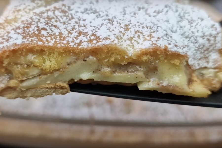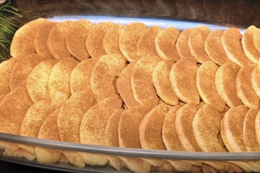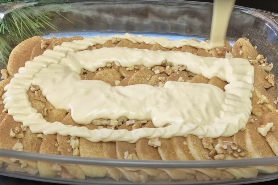 Šis deserts izdodas neticami sulīgs, bet apakšpusē patīkami kraukšķīgs. Kamēr cepumi uzsūc ābolu sulu un pārvēršas maigā pamatnē, virtuve piepildās ar tik saldu un mājīgu aromātu, ka mājinieki uzreiz pulcēsies ap galdu.