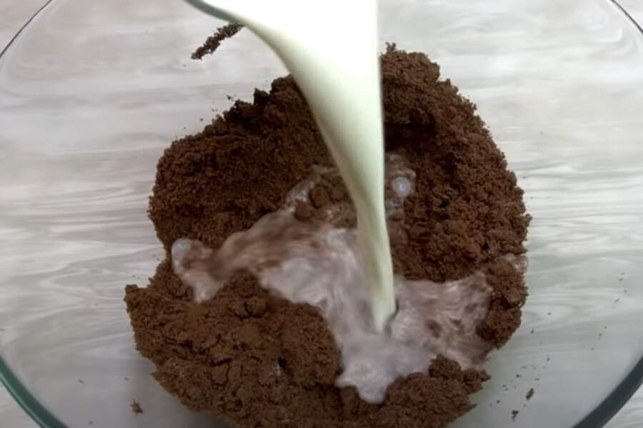 Ieberiet sasmalcinātos cepumus bļodā un pievienojiet cepamo pulveri. Kārtīgi samaisiet sausās sastāvdaļas. Pēc tam lēnām lejiet klāt pienu, nepārtraukti maisot ar karoti vai putojamo slotiņu. Masa kļūs tumša, spīdīga un vizuāli atgādinās parastu šokolādes mīklu.