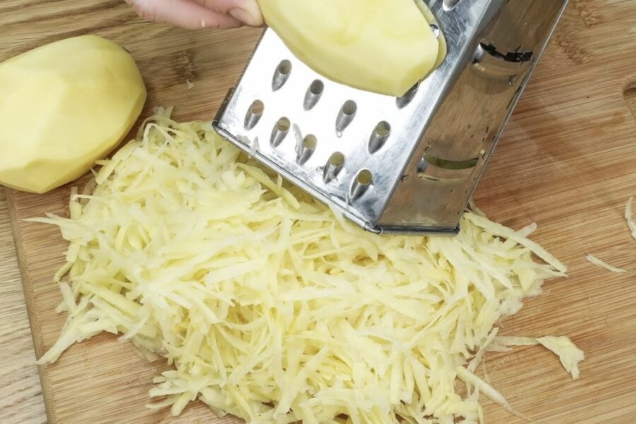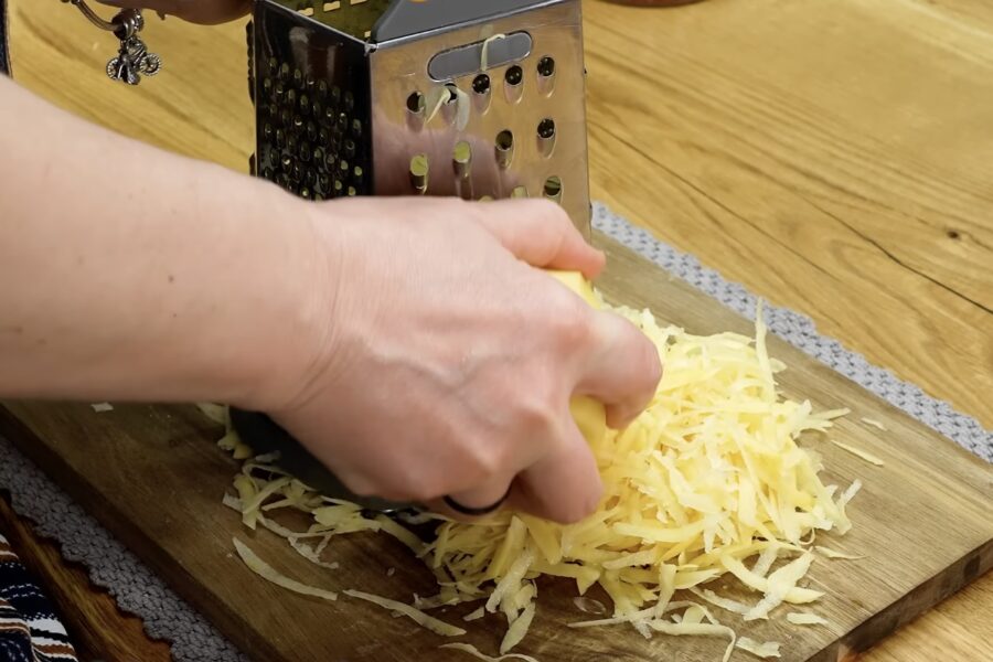 Pats galvenais šajā receptē ir kartupeļu sagatavošana, lai tie pannā neizjuktu un būtu kraukšķīgi. Es parasti ņemu trīs vidēja izmēra kartupeļus un sarīvēju tos uz rupjās rīves. Lai pamatne nebūtu par daudz šķidra, sarīvētos kartupeļus vajag kārtīgi nospiest ar rokām, izspiežot lieko sulu.