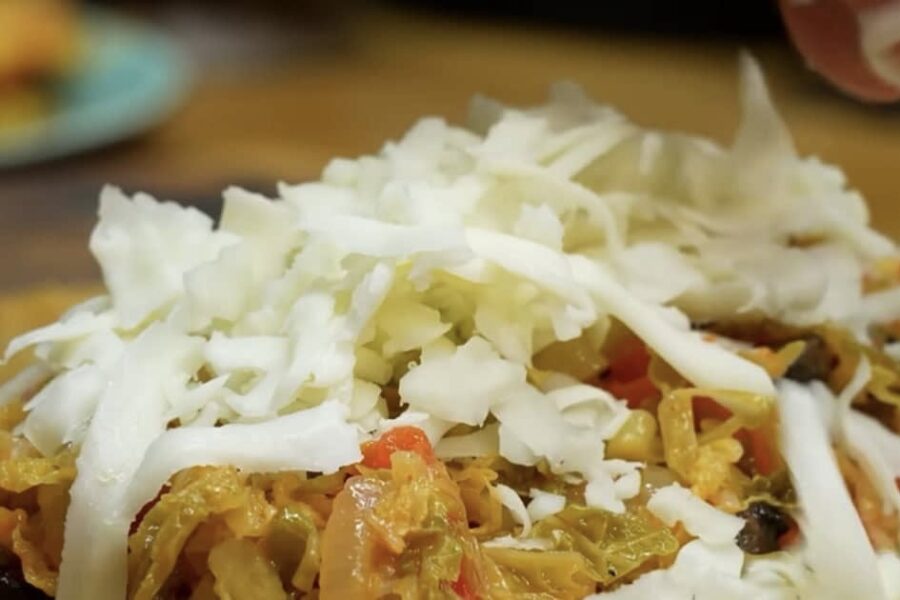 Lai pildījums būtu bagātīgāks, es pievienoju arī smalki sašķērētus kāpostus un atsevišķi apceptas sēnes. Kāposti šim maisījumam iedod tilpumu un kraukšķīgumu, bet sēnes – meža aromātu. Visu pasautēju, līdz kāposti kļūst mīksti, un tad ļauju pildījumam bļodā nedaudz atdzist. Šis dārzeņu maisījums ir tik garšīgs, ka to reizēm gribas apēst tāpat vien.