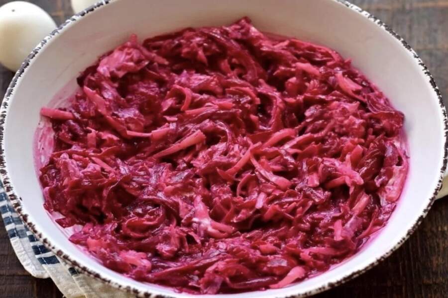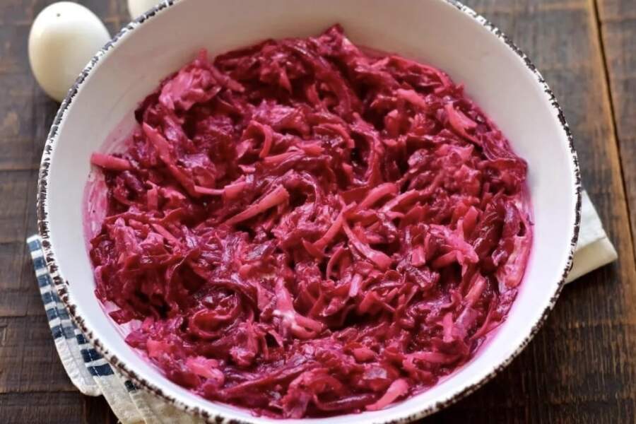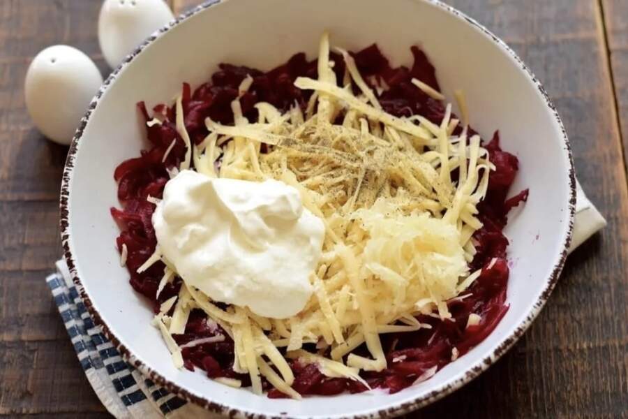 Sākumā es sarīvēju vārītas bietes uz rupjās rīves. Es neiesaku tās rīvēt pārāk smalki, jo tad salāti zaudē savu tekstūru un kļūst pārāk ūdeņaini. Tad es ņemu cieto sieru un sarīvēju to tieši tajā pašā bļodā. Siera un biešu attiecībai jābūt tādai, lai siers būtu jūtams katrā kumosā.