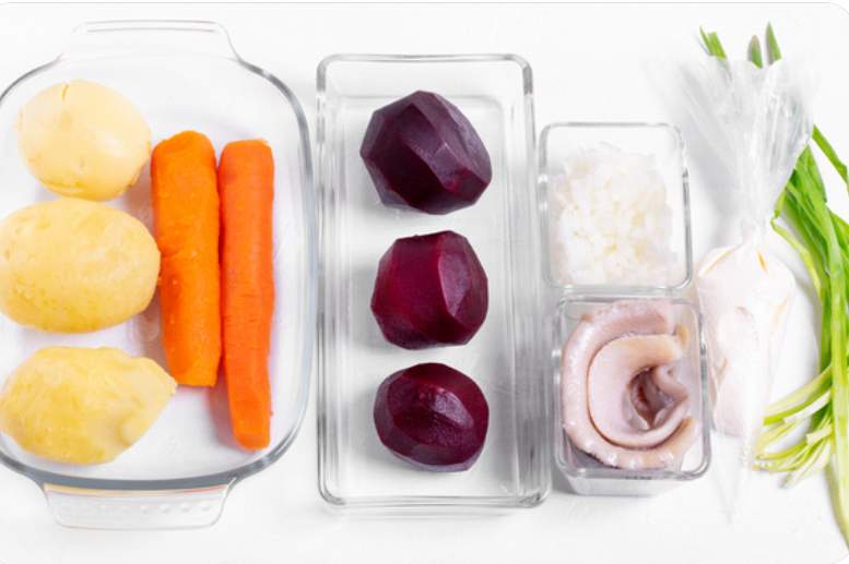 Kartupeļus, burkānus un bietes rūpīgi nomazgāt un novārīt ar mizu līdz gatavībai (aptuveni 30–40 minūtes, atkarībā no izmēra). Svarīgi nepārvārīt! Olas novārīt cieti (aptuveni 10 minūtes pēc uzvārīšanās). Dārzeņus un olas atdzesēt. Notīrīt kartupeļiem, burkāniem un bietēm mizu un olām čaumalas. Siļķi sadalīt filējās, izņemt visas asakas (pat vissmalkākās!). Sagriezt siļķes filē mazos kubiņos.