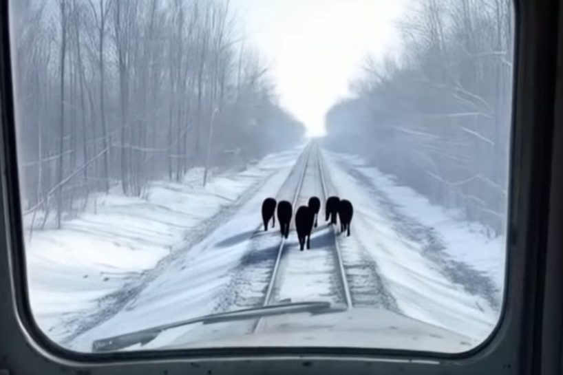 Tas, ko viņš ieraudzīja, lika viņa sirdij sisties straujāk. Uz sliedēm atradās kaut kādi dzīvnieki, un šķita, ka tie negrasās atkāpties. Kad vilciens pienāca tuvāk, Deniss ar pārsteigumu saskatīja vilku baru. Pelēcīgi baltie silueti asi izcēlās uz sniega fona. Dzīvnieki stāvēja ciešā grupā tieši uz sliedēm, it kā tīši aizšķērsojot ceļu.