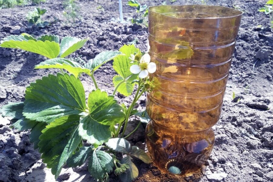 Ja man ir jādod papildmēslojums, es to vienkārši atšķaidu spainī un ieleju tieši pudelē. Esmu droša, ka visas vērtīgās vielas aiziet mērķtiecīgi pie auga, nevis izskalojas pa visu dobi. Tas ir efektīvi, jo viss nonāk tieši mērķī. Pudeles kakliņu es parasti nedaudz piesedzu vai uzlieku vāciņu, lai iekšā nesakristu zeme vai nesalīstu kukaiņi.