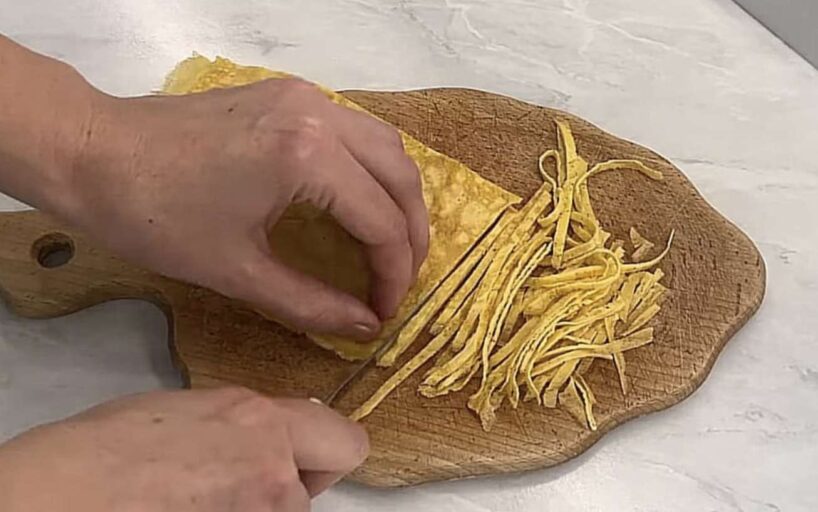 Tālāk gatavo olas, taču nevis tās tradicionāli vārot, bet gan uzcepot plānus olu plāceņus. Olas samaisa ar šķipsnu sāls un piparu, un masu lej uz sakarsētas pannas, lai izveidotos ļoti plāns, viegls omletes biezuma slānis. Kad tas ir gatavs, to sagriež smalkās strēmelēs. Šāda olu pievienošanas metode padara salātus vieglākus un piešķir tiem patīkamu tekstūru, kas atšķiras no ierastās vārītu olu garšas.